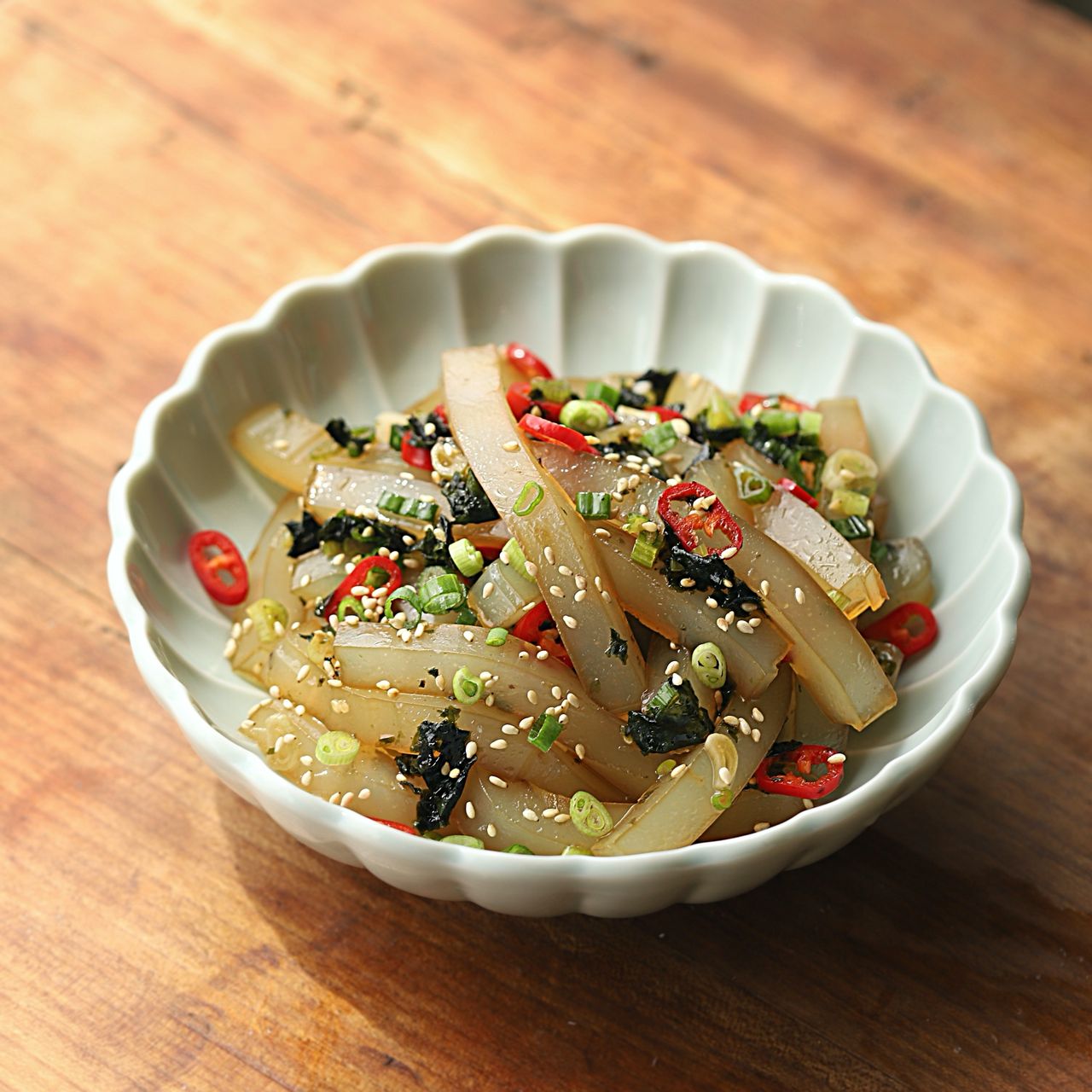 끓는 물에 데치면 투명해진다. 찬물에 헹구어 식혀주세요.